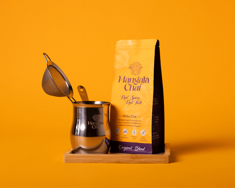 Das Mangala Chai Set besteht aus dem hochwertigen Bambusbrett, Chai Pot und passendem Sieb, inklusive dem Original Blend