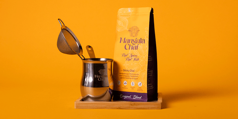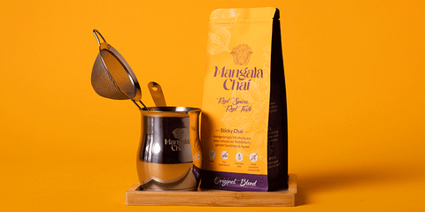 Füge 3-4 Teelöffel Mangala Chai in deinen Chai Pot oder einen Kochtopf und gieße das Ganze mit ca. 50ml heißem Wasser auf. Kurz umrühren.